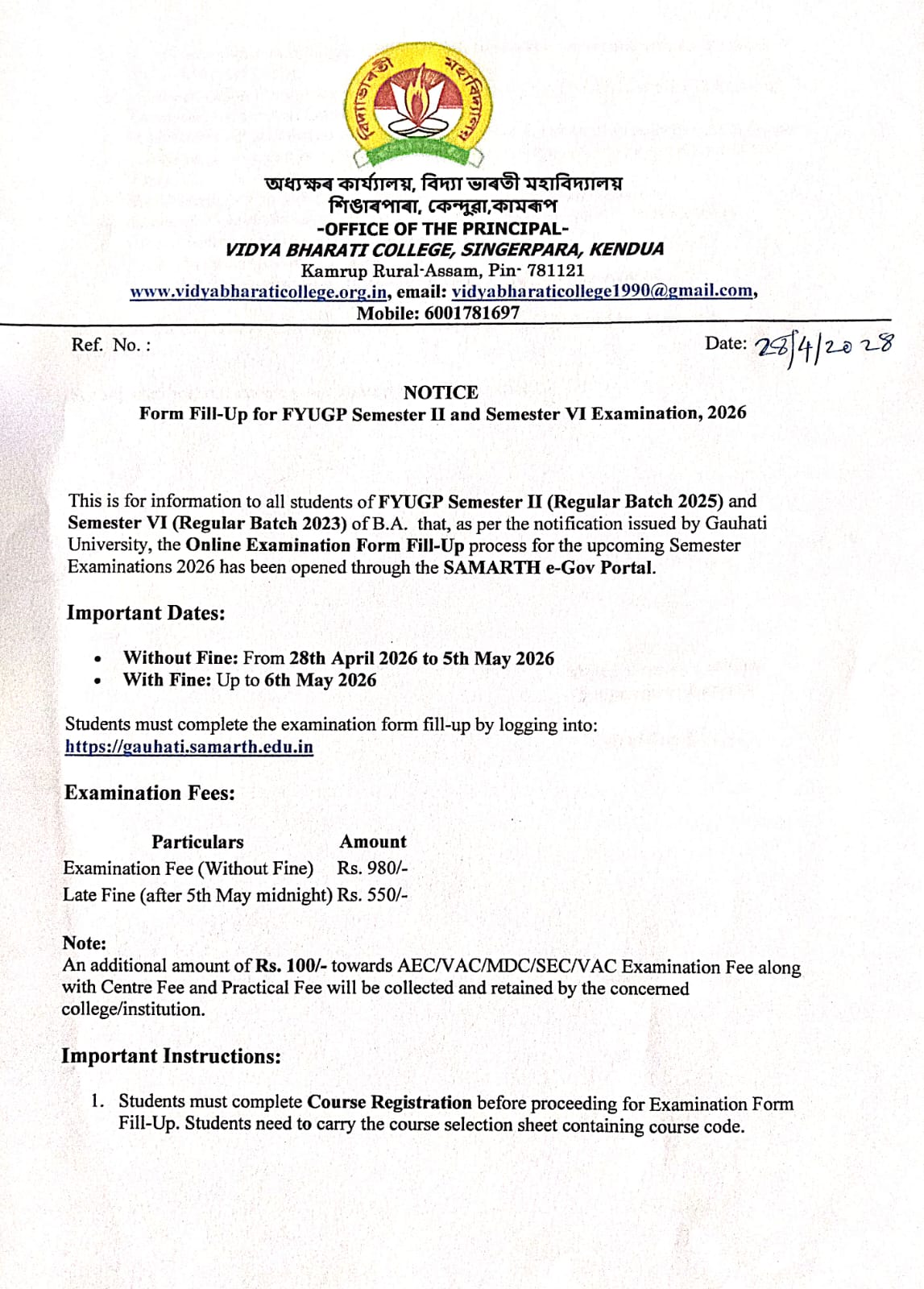 Vidya Bharati College, the pride of Kamrup (R) District is established amidst different hurdles in 1990. Since then the college has been growing successfully. The college is permanently affiliated to the University of Gauhati during 2003-04 sessions and govt. Concurrence was accorded in 2005 w.e.f. the session 1997-98. In its quest for glory, college is indebted to numerous individuals and institutions. The college authorities gratefully acknowledges its gratitude to all those who have extended their help in taking this institution to its present stature. The college is proud to have a main building with a big playground with an extension of an administrative corner. As a little distance towards south, a sports complex and a women’s hostel are constructed. There are 9 Departments in Arts stream in the college. Following the directives of Gauhati University the college has introduced Semester System from the year 2011 in its Degree course. From this year i.e., on and from 2019-20 session, The college has introduced CBCS in Degree courses. It is a matter of pride that within a very short span of time Vidya Bharati College has blossomed to fragrance and establishes itself as a premier institution of higher education. Read More