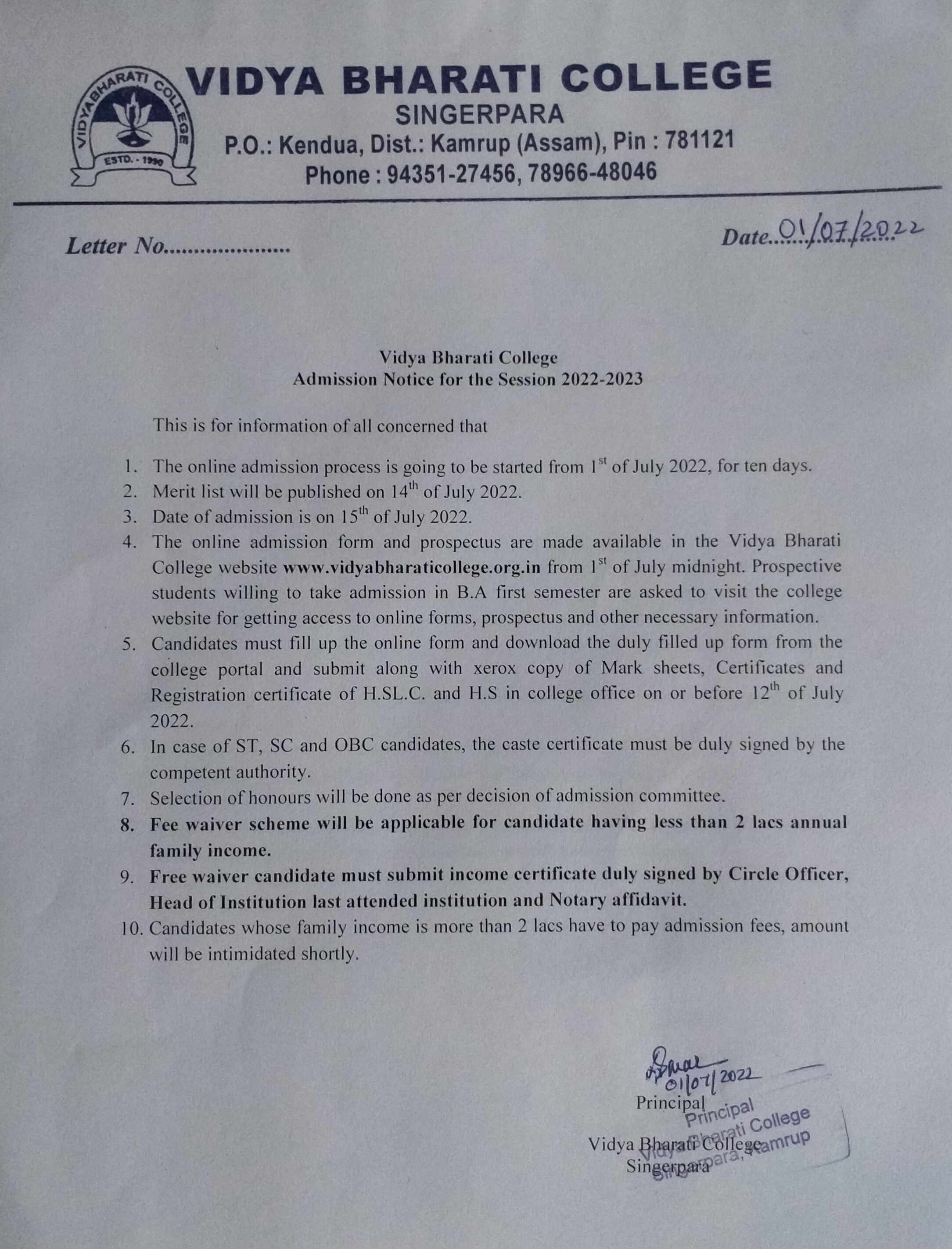 Admission process is going on. Prospective students willing to take Admission please visit Vidya Bharati College web site, and complete through online portal. View 2022-07-02