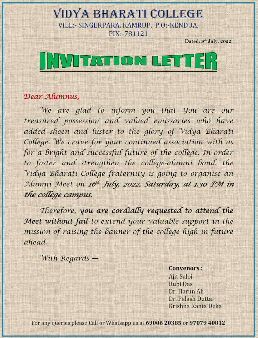 First ever alumni meet is going to be held at college premises on 16th July. All alumnus are cordially invited on the day as per the invitation letter shared. View 2022-07-09